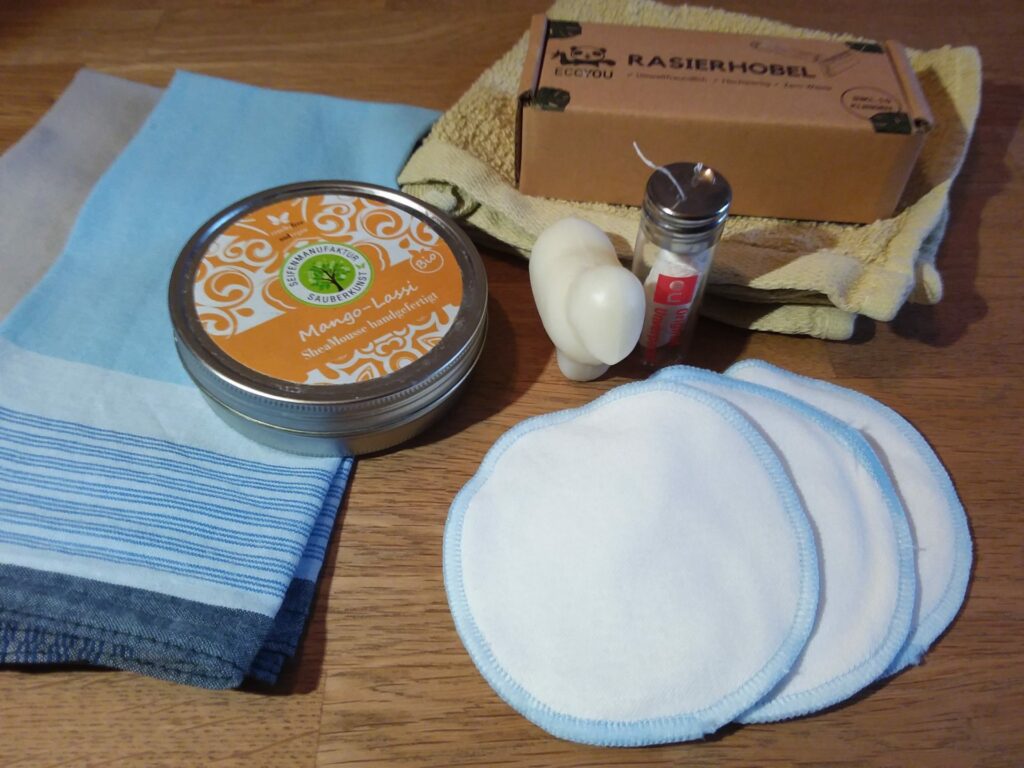 Mehrweg statt Einweg ist auch im Bad ein prima Motto. Stofftaschentücher, der Baumwoll-Seiflappen, waschbare Abschminkpads und für die Damen waschbare Slipeinlagen oder die Menstruationstasse helfen, jede Menge Müll zu vermeiden. Zahnseide gibt es immerhin plastikfrei.